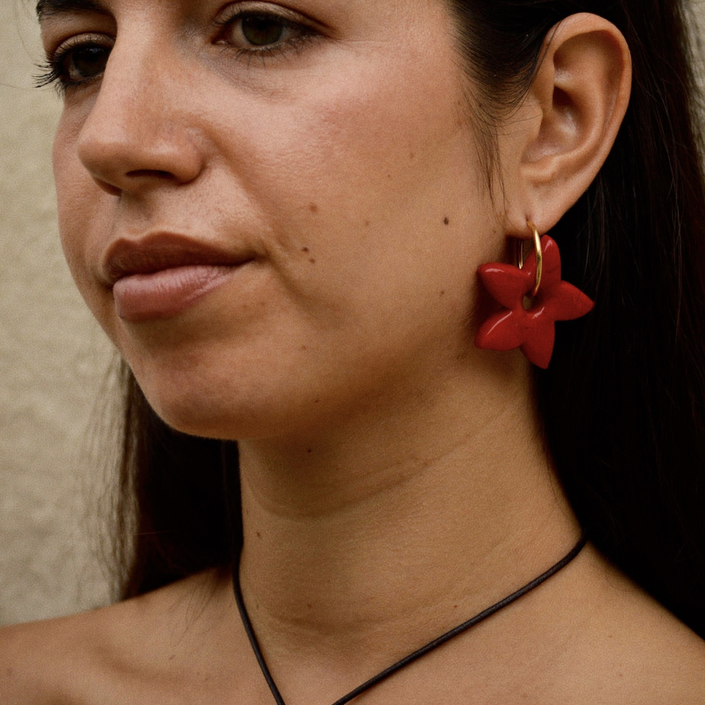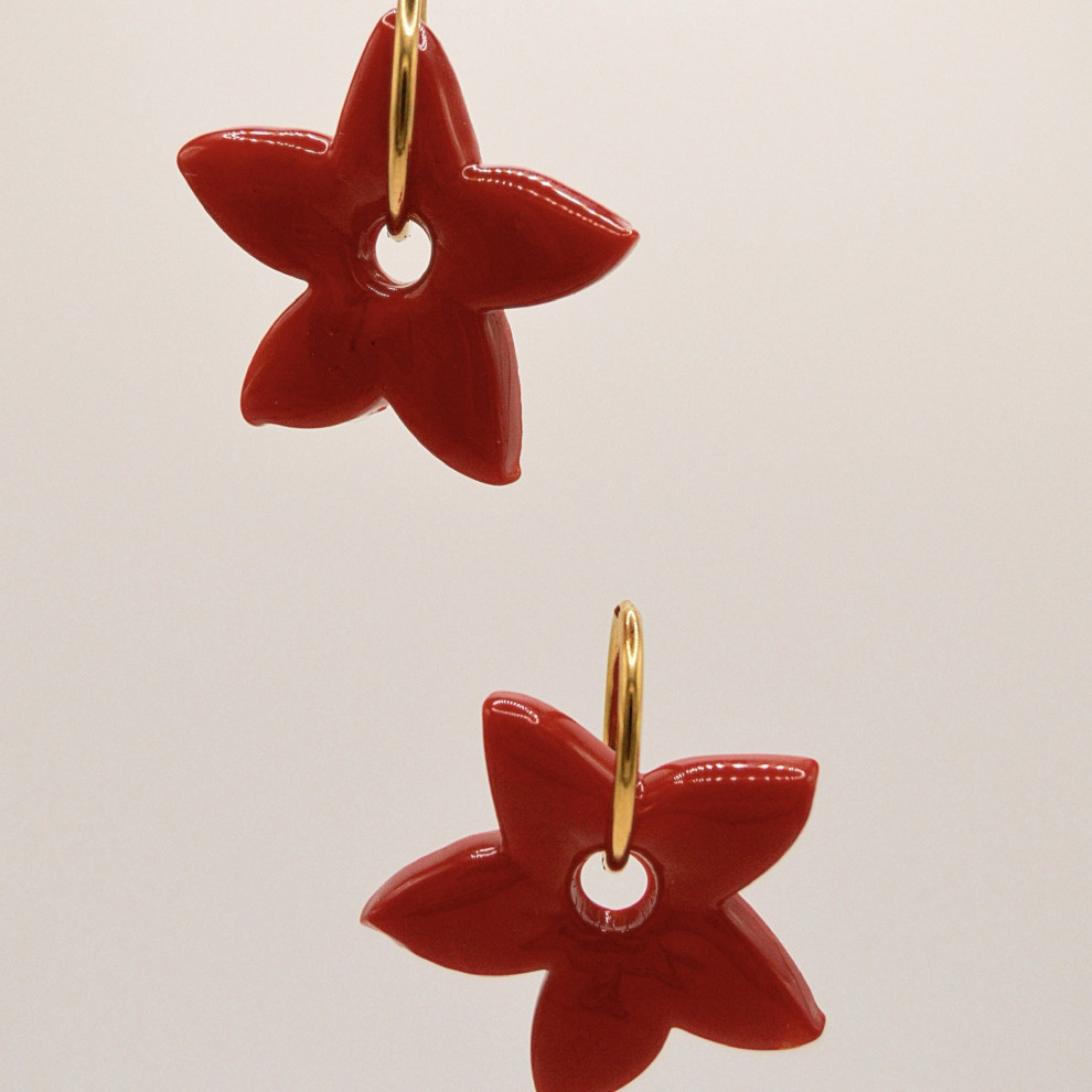 Pendientes con aro de acero inoxidable dorado que atraviesa una flor de vidrio de Murano. Su forma inspirada en el lirio y la textura de aguas en el vidrio crean una pieza ligera, artística y llena de movimiento. Cada flor refleja la luz de forma distinta, haciendo de cada pieza única.