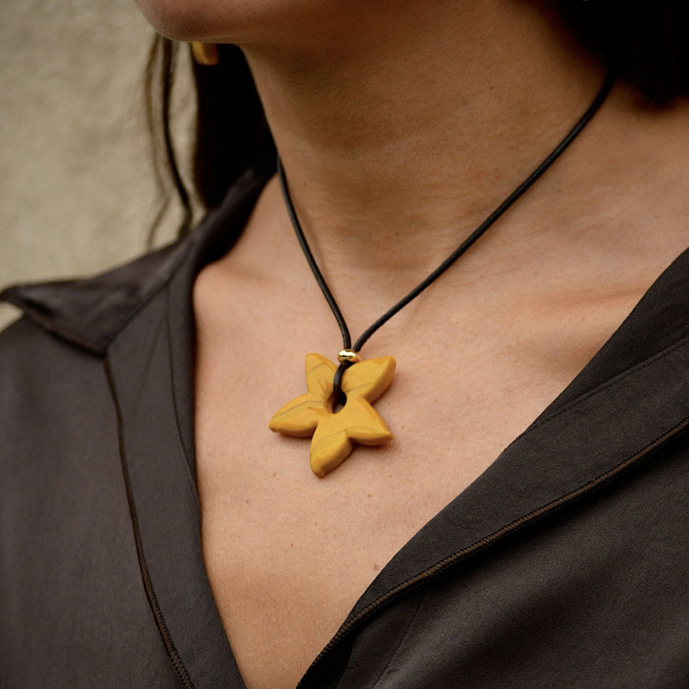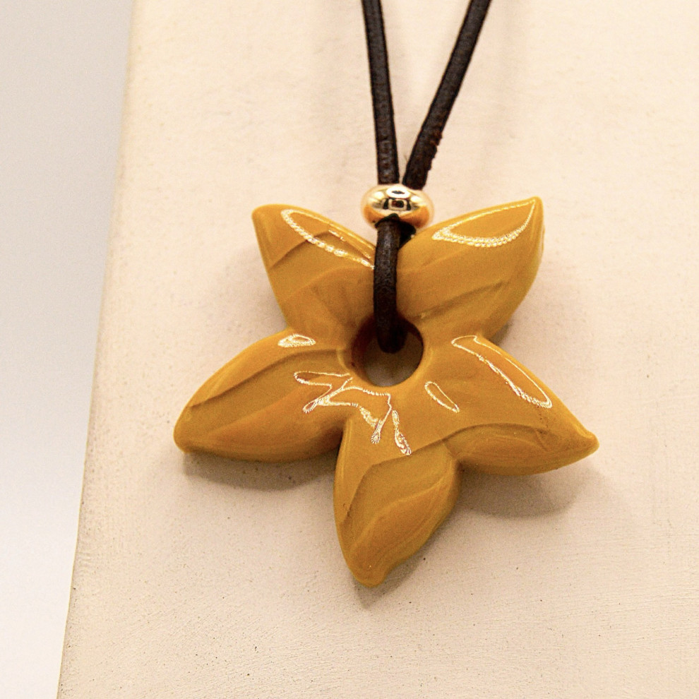 Collar con cordón de cuero y una flor de vidrio de Murano como pieza central. Su forma inspirada en el lirio y la textura de aguas en el vidrio crean una pieza ligera, artística y llena de movimiento. Cada flor refleja la luz de forma distinta, haciendo de cada pieza única.