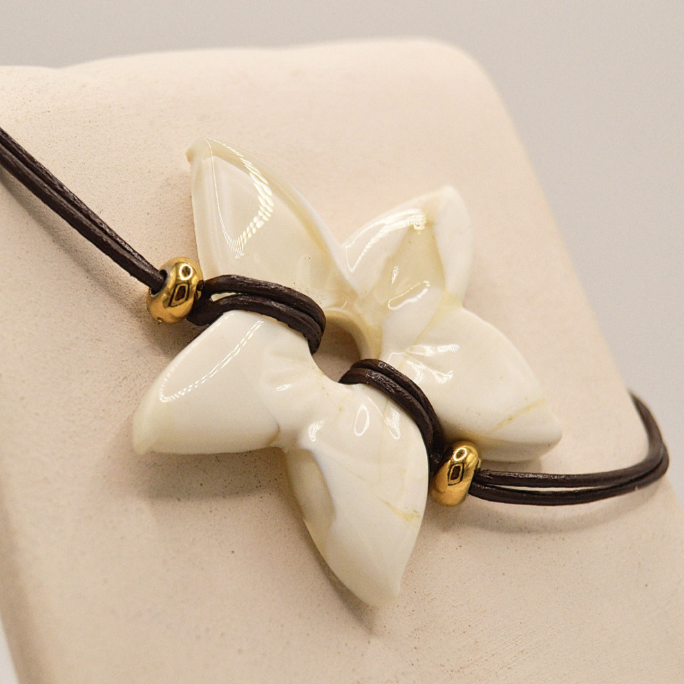 Pulsera con cordón de cuero marrón y una flor de vidrio de Murano en el centro. Su forma inspirada en el lirio y la textura de aguas en el vidrio crean una pieza ligera, artística y llena de movimiento. Cada flor refleja la luz de forma distinta, haciendo de cada pieza única.