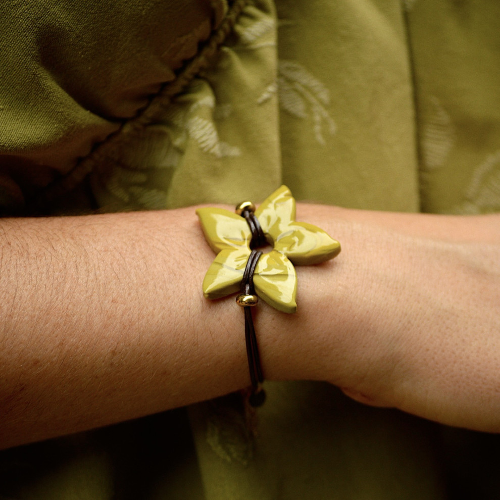 Pulsera con cordón de cuero marrón y una flor de vidrio de Murano en el centro. Su forma inspirada en el lirio y la textura de aguas en el vidrio crean una pieza ligera, artística y llena de movimiento. Cada flor refleja la luz de forma distinta, haciendo de cada pieza única.
