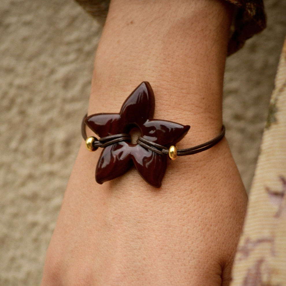 Pulsera con cordón de cuero marrón y una flor de vidrio de Murano en el centro. Su forma inspirada en el lirio y la textura de aguas en el vidrio crean una pieza ligera, artística y llena de movimiento. Cada flor refleja la luz de forma distinta, haciendo de cada pieza única.