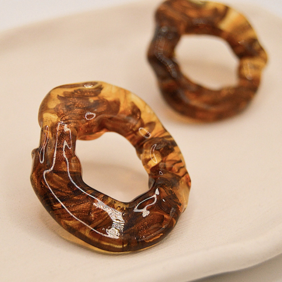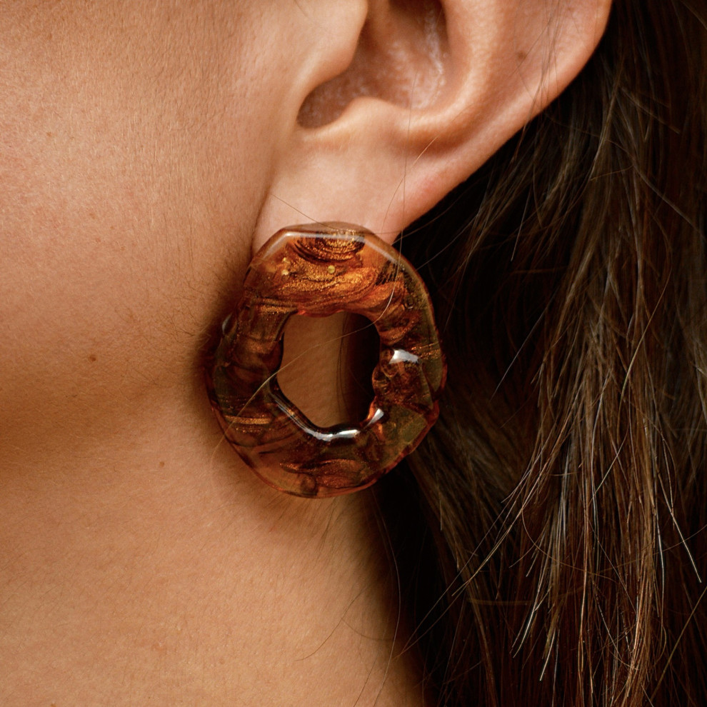 Pendientes de vidrio de Murano con forma orgánica. Marrón con reflejos dorados, su interior contiene delicados brillos de purpurina que capturan la luz con sutileza. Cada pieza es única, modelada a mano y pensada para reflejar la magia de la noche.